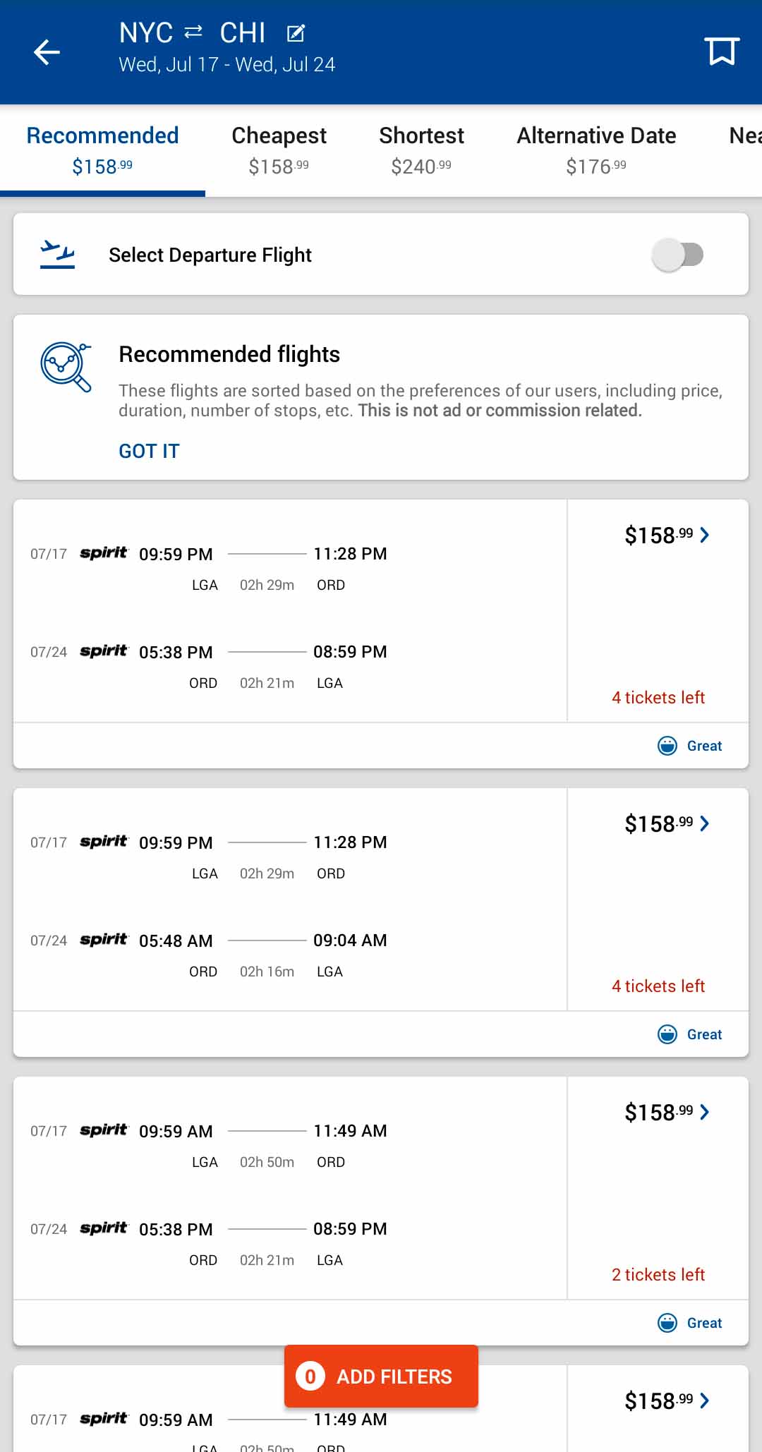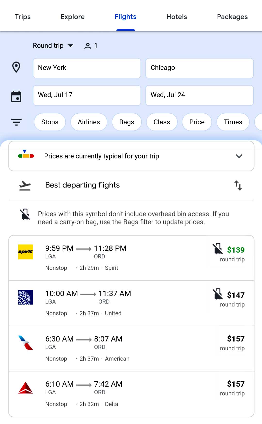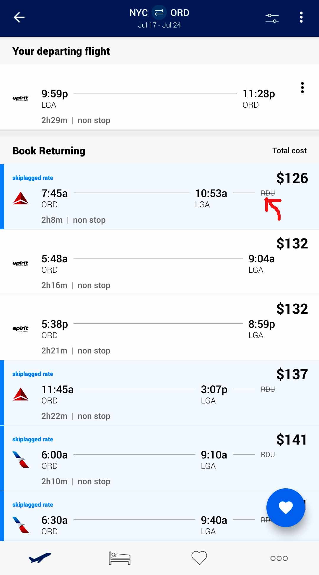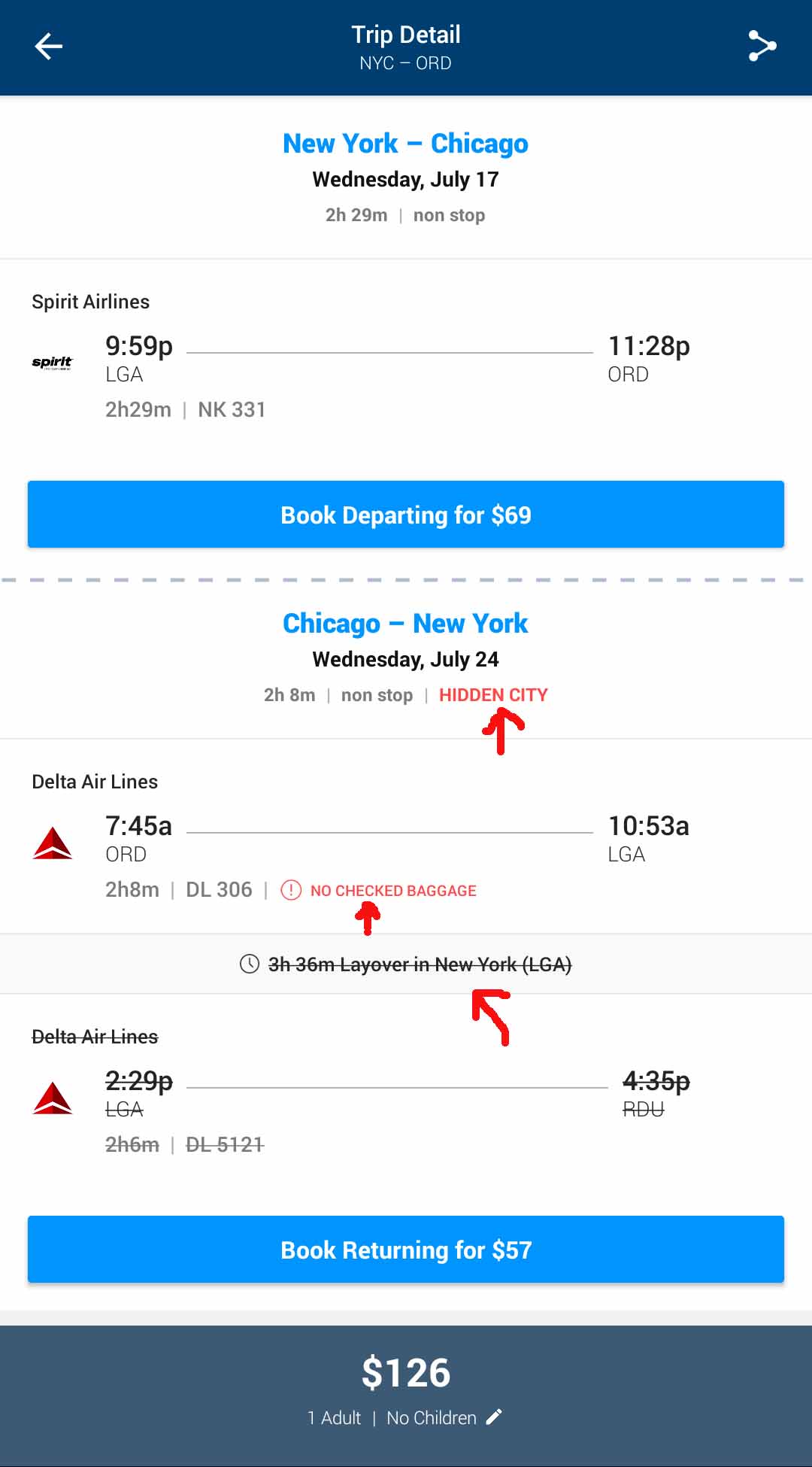 So, let’s look at the bottom price of Spirit Airlines. On the Skiplagged app the price of the Spirit Airlines NYC to Chicago flight is $126, but If you want to have a carry-on they want to charge you $55! ($52 for a checked bag. Why is it more expensive to have a carry-on bag?!) That price is insane! But if you booked with Delta it’s $130 with the price of the carry-on included. So, be careful with these discount airlines. Make sure to read all of their luggage requirements. Or just avoid discount airlines altogether.