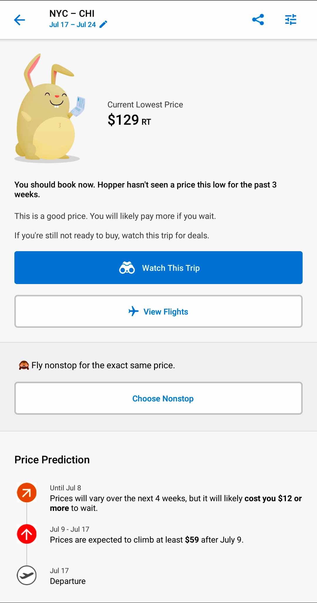 I like the Hopper app. It has a plump lil bunny you can look at while browsing for flights. More importantly it tells you trends and shares the price patterns with your desired flight route. It’ll tell you if it knows based on patterns if the flight will raise or lower in price in the future. It gives you suggestions on whether or not it is the best time to book your flight. I love the visual aesthetic of this app a lot!